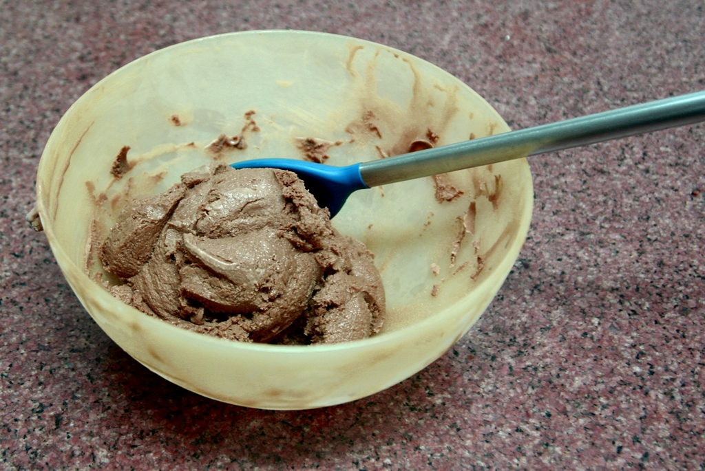 Next we transferred the custard to a plastic bowl to chill in the fridge (in our case, overnight; but a few hours should do). This morning I put the mixture in a larger bowl and put it in the freezer. Every 30 minutes for about 3 or 4 hours (or until frozen), I removed the ice cream and gave it a good stir with an electric mixture to break up all of the ice crystals.